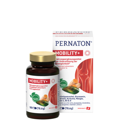 Die Pernaton® MOBILITY+ Kapseln enthalten Grünlippmuschelextrakt, Glucosamin, Chondroitin, Kurkuma, Mangan und Vitamin C, B3 sowie D.