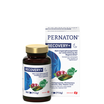 Die Pernaton® RECOVERY+ Kapseln enthalten Grünlippmuschelextrakt, Montmorency Sauerkirschenextrakt, Zink und Vitamin C sowie D.